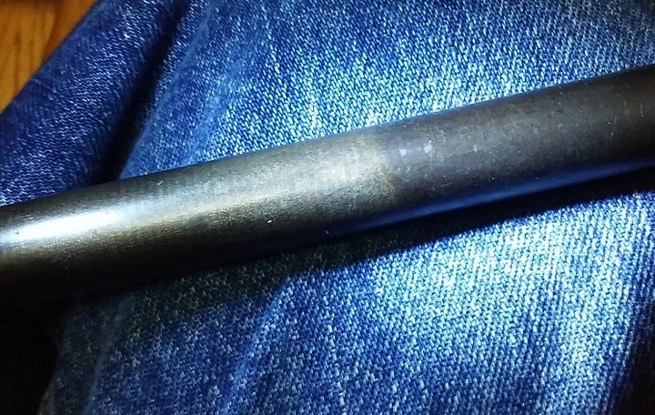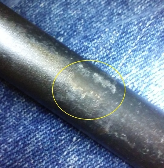 Bayonet shadow markings; here are other indicators to look out for on them. Held in hand, nobody can mistake what we have here. Band shadow from Hades. Confused In pic 2, note the circled area that doesn't photo well shows the pad wear from the type III barrel band. There will usually be at least one more mark from the 3 pads on a bayo lug. Someone chemically treated it to hide the shiny spot of the pad wear.