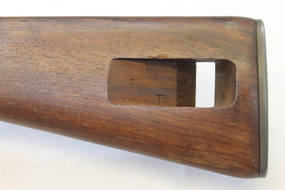 This second block INLAND carbine has a high-wood stock that was manufactured for the National Postal Meter company. In July of 1943 it was requested that NPM transfer 1,000 stocks to INLAND. This is one of those stocks. It was made for NPM by the Trimble Nurseryland Furniture Company and stamped Trimble over TN in the sling cut. The transfer marks added were 'I' and 'T.I.'