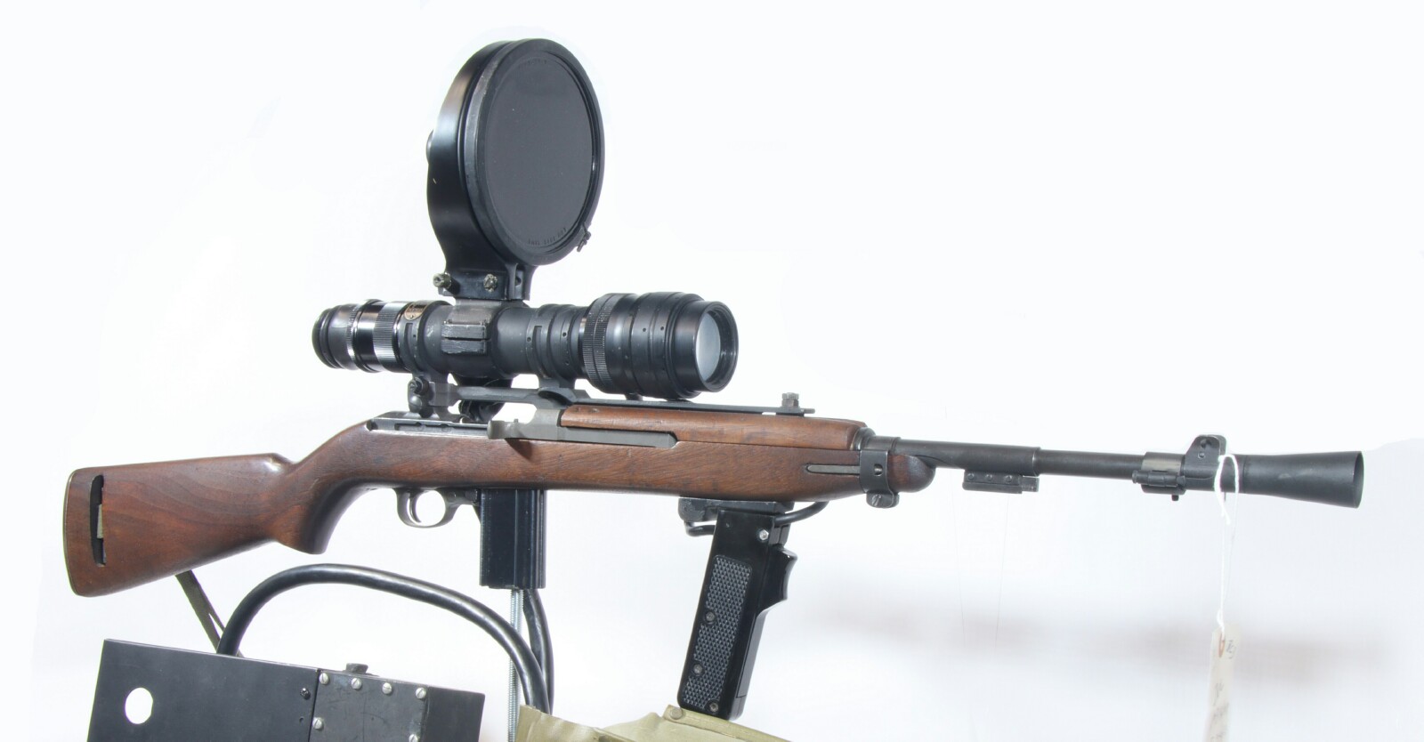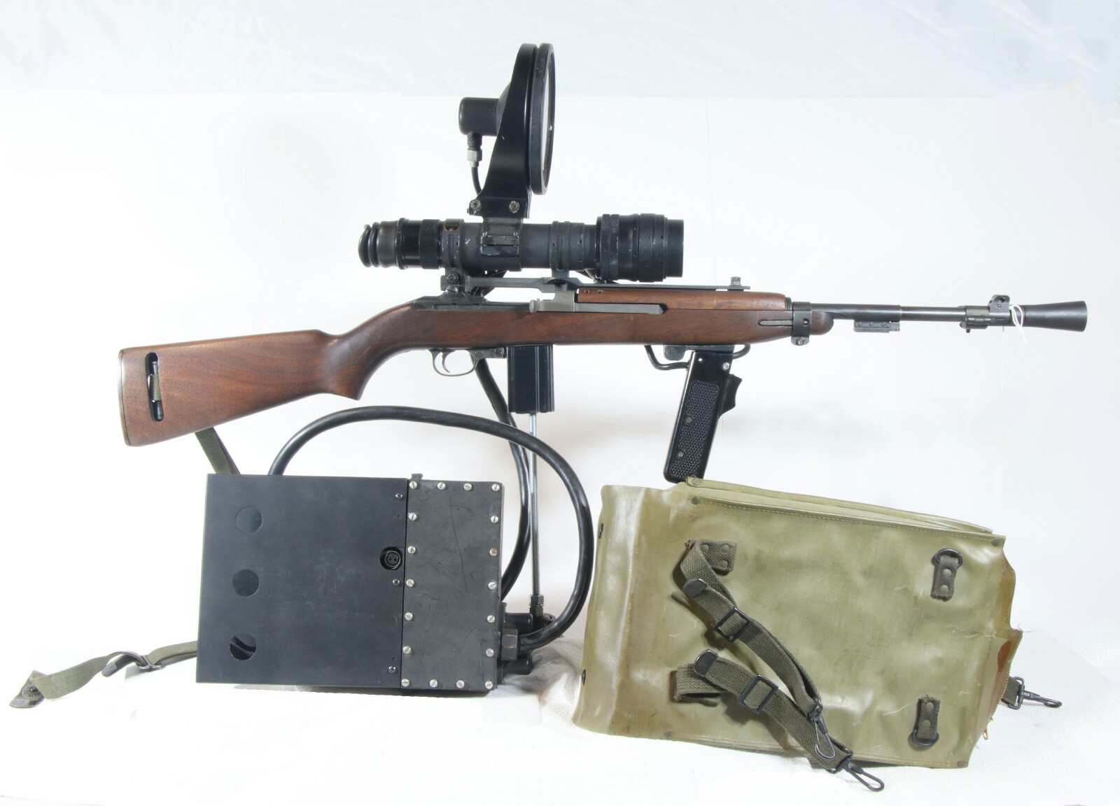 Semi-auto only version of M3 carbine with working M2-1050-50 Infrared scope. Mixmaster. SG subcontract receiver with Federal Ordnance import mark. Barrel fails no-go headspace gauge, swallows muzzle gauge. Barrel fails no-go headspace gauge, swallows muzzle gauge. Fully functional M2 sniperscopes with functional original power supply are almost non-existant. No original 6 volt acid battery in this one's battery case. Place a modern day rechargeable 6 volt sealed lead acid battery in the case and this one is good to go without the need for acid. Includes the late M2 backpack and all shown in the photos below. Estimated Value: SOLD ![]() ![]() ![]() ![]() ![]() ![]() ![]() ![]() ![]()