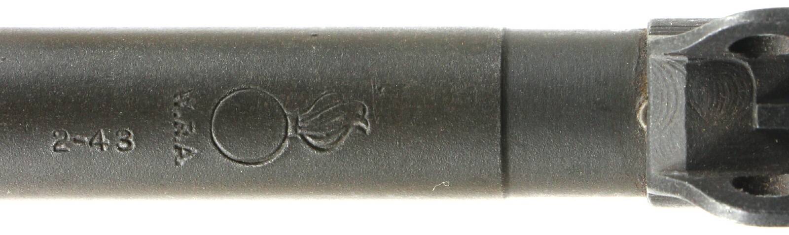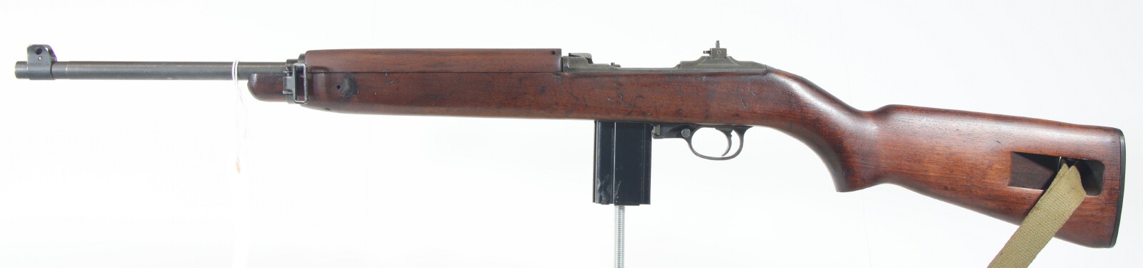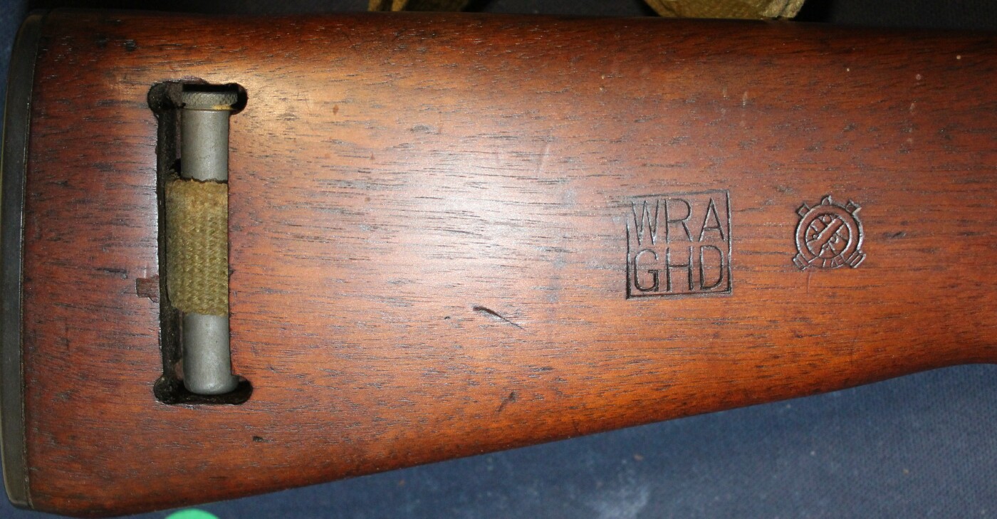 Restored - Type I springtube receiver, WRA 2-43 bbl, unmarked milled front sight, unmarked type I bbl band, type I high wood I cut stock with WRA GHD cartouche and crossed cannons (1, 2, 8 bottom of stock), W handguard, rear flip sight with S, W flat bolt, W type I slide, W type II trigger housing with early pin, dogleg hammer with unk marking, type I push button safety, type IA unmarked mag catch, early WWII sling, 4697 on magazine. Includes sling, oiler, and magazine. Estimated Value: SOLD ![]() ![]() ![]() ![]() ![]() ![]() ![]() ![]() ![]() ![]() ![]() ![]() ![]() ![]() ![]()