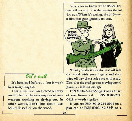 Uncle Sam's only approved finish for wood rifle stocks is RAW linseed oil (RLO), with pure tung oil as a possible substitute.