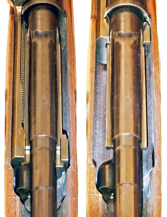One of the more noteworthy changes is the gas piston housing was moved to the 5 o'clock position on the barrel, in line with the recoil spring. The slide was redesigned with a reinforced area at the point of contact with the gas piston. The left side of the slide body was slightly down sized and the slide body was shortened. ![]() Left: Slide in the forward position; Right: slide fully retracted |