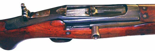 The lever at the rear of the receiver is the safety. Rotating the lever up blocks the hammer from striking the rear of the bolt.